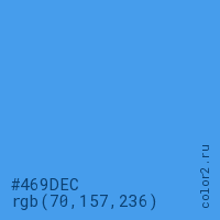 Цвет #469DEC в цветовой модели RGB обозначается тремя октетами (70, 157, 236) в десятичном формате и #469DEC в шестнадцатиричном (hex) формате, которые являются интенсивностью красного 70 (hex 46), интенсивность зелёного 157 (hex 9D) и интенсивность синего 236 (hex EC).