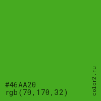 Цвет #46AA20 в цветовой модели RGB обозначается тремя октетами (70, 170, 32) в десятичном формате и #46AA20 в шестнадцатиричном (hex) формате, которые являются интенсивностью красного 70 (hex 46), интенсивность зелёного 170 (hex AA) и интенсивность синего 32 (hex 20).