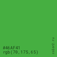 Цвет #46AF41 в цветовой модели RGB обозначается тремя октетами (70, 175, 65) в десятичном формате и #46AF41 в шестнадцатиричном (hex) формате, которые являются интенсивностью красного 70 (hex 46), интенсивность зелёного 175 (hex AF) и интенсивность синего 65 (hex 41).