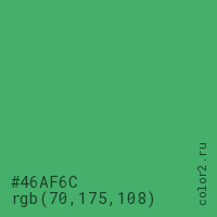 Цвет #46AF6C в цветовой модели RGB обозначается тремя октетами (70, 175, 108) в десятичном формате и #46AF6C в шестнадцатиричном (hex) формате, которые являются интенсивностью красного 70 (hex 46), интенсивность зелёного 175 (hex AF) и интенсивность синего 108 (hex 6C).
