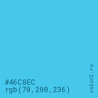 Цвет #46C8EC в цветовой модели RGB обозначается тремя октетами (70, 200, 236) в десятичном формате и #46C8EC в шестнадцатиричном (hex) формате, которые являются интенсивностью красного 70 (hex 46), интенсивность зелёного 200 (hex C8) и интенсивность синего 236 (hex EC).