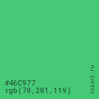 Цвет #46C977 в цветовой модели RGB обозначается тремя октетами (70, 201, 119) в десятичном формате и #46C977 в шестнадцатиричном (hex) формате, которые являются интенсивностью красного 70 (hex 46), интенсивность зелёного 201 (hex C9) и интенсивность синего 119 (hex 77).