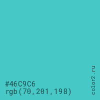 Цвет #46C9C6 в цветовой модели RGB обозначается тремя октетами (70, 201, 198) в десятичном формате и #46C9C6 в шестнадцатиричном (hex) формате, которые являются интенсивностью красного 70 (hex 46), интенсивность зелёного 201 (hex C9) и интенсивность синего 198 (hex C6).