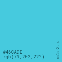 Цвет #46CADE в цветовой модели RGB обозначается тремя октетами (70, 202, 222) в десятичном формате и #46CADE в шестнадцатиричном (hex) формате, которые являются интенсивностью красного 70 (hex 46), интенсивность зелёного 202 (hex CA) и интенсивность синего 222 (hex DE).