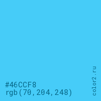 Цвет #46CCF8 в цветовой модели RGB обозначается тремя октетами (70, 204, 248) в десятичном формате и #46CCF8 в шестнадцатиричном (hex) формате, которые являются интенсивностью красного 70 (hex 46), интенсивность зелёного 204 (hex CC) и интенсивность синего 248 (hex F8).