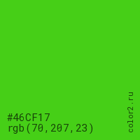 Цвет #46CF17 в цветовой модели RGB обозначается тремя октетами (70, 207, 23) в десятичном формате и #46CF17 в шестнадцатиричном (hex) формате, которые являются интенсивностью красного 70 (hex 46), интенсивность зелёного 207 (hex CF) и интенсивность синего 23 (hex 17).