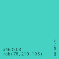 Цвет #46D2C3 в цветовой модели RGB обозначается тремя октетами (70, 210, 195) в десятичном формате и #46D2C3 в шестнадцатиричном (hex) формате, которые являются интенсивностью красного 70 (hex 46), интенсивность зелёного 210 (hex D2) и интенсивность синего 195 (hex C3).