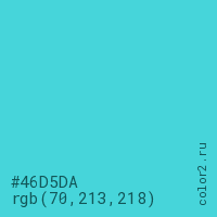 Цвет #46D5DA в цветовой модели RGB обозначается тремя октетами (70, 213, 218) в десятичном формате и #46D5DA в шестнадцатиричном (hex) формате, которые являются интенсивностью красного 70 (hex 46), интенсивность зелёного 213 (hex D5) и интенсивность синего 218 (hex DA).