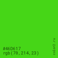 Цвет #46D617 в цветовой модели RGB обозначается тремя октетами (70, 214, 23) в десятичном формате и #46D617 в шестнадцатиричном (hex) формате, которые являются интенсивностью красного 70 (hex 46), интенсивность зелёного 214 (hex D6) и интенсивность синего 23 (hex 17).