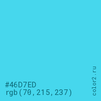 Цвет #46D7ED в цветовой модели RGB обозначается тремя октетами (70, 215, 237) в десятичном формате и #46D7ED в шестнадцатиричном (hex) формате, которые являются интенсивностью красного 70 (hex 46), интенсивность зелёного 215 (hex D7) и интенсивность синего 237 (hex ED).