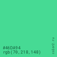 Цвет #46DA94 в цветовой модели RGB обозначается тремя октетами (70, 218, 148) в десятичном формате и #46DA94 в шестнадцатиричном (hex) формате, которые являются интенсивностью красного 70 (hex 46), интенсивность зелёного 218 (hex DA) и интенсивность синего 148 (hex 94).