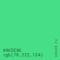 Цвет #46DE86 в цветовой модели RGB обозначается тремя октетами (70, 222, 134) в десятичном формате и #46DE86 в шестнадцатиричном (hex) формате, которые являются интенсивностью красного 70 (hex 46), интенсивность зелёного 222 (hex DE) и интенсивность синего 134 (hex 86).