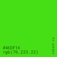 Цвет #46DF16 в цветовой модели RGB обозначается тремя октетами (70, 223, 22) в десятичном формате и #46DF16 в шестнадцатиричном (hex) формате, которые являются интенсивностью красного 70 (hex 46), интенсивность зелёного 223 (hex DF) и интенсивность синего 22 (hex 16).