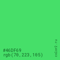 Цвет #46DF69 в цветовой модели RGB обозначается тремя октетами (70, 223, 105) в десятичном формате и #46DF69 в шестнадцатиричном (hex) формате, которые являются интенсивностью красного 70 (hex 46), интенсивность зелёного 223 (hex DF) и интенсивность синего 105 (hex 69).