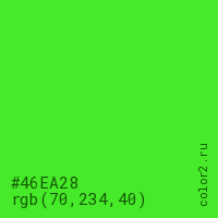 Цвет #46EA28 в цветовой модели RGB обозначается тремя октетами (70, 234, 40) в десятичном формате и #46EA28 в шестнадцатиричном (hex) формате, которые являются интенсивностью красного 70 (hex 46), интенсивность зелёного 234 (hex EA) и интенсивность синего 40 (hex 28).