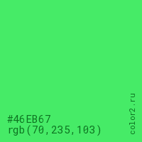 Цвет #46EB67 в цветовой модели RGB обозначается тремя октетами (70, 235, 103) в десятичном формате и #46EB67 в шестнадцатиричном (hex) формате, которые являются интенсивностью красного 70 (hex 46), интенсивность зелёного 235 (hex EB) и интенсивность синего 103 (hex 67).