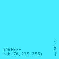 Цвет #46EBFF в цветовой модели RGB обозначается тремя октетами (70, 235, 255) в десятичном формате и #46EBFF в шестнадцатиричном (hex) формате, которые являются интенсивностью красного 70 (hex 46), интенсивность зелёного 235 (hex EB) и интенсивность синего 255 (hex FF).