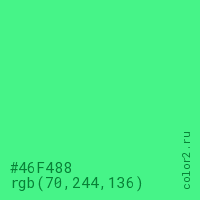 Цвет #46F488 в цветовой модели RGB обозначается тремя октетами (70, 244, 136) в десятичном формате и #46F488 в шестнадцатиричном (hex) формате, которые являются интенсивностью красного 70 (hex 46), интенсивность зелёного 244 (hex F4) и интенсивность синего 136 (hex 88).