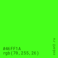 Цвет #46FF1A в цветовой модели RGB обозначается тремя октетами (70, 255, 26) в десятичном формате и #46FF1A в шестнадцатиричном (hex) формате, которые являются интенсивностью красного 70 (hex 46), интенсивность зелёного 255 (hex FF) и интенсивность синего 26 (hex 1A).