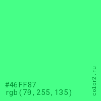 Цвет #46FF87 в цветовой модели RGB обозначается тремя октетами (70, 255, 135) в десятичном формате и #46FF87 в шестнадцатиричном (hex) формате, которые являются интенсивностью красного 70 (hex 46), интенсивность зелёного 255 (hex FF) и интенсивность синего 135 (hex 87).