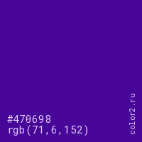 Цвет #470698 в цветовой модели RGB обозначается тремя октетами (71, 6, 152) в десятичном формате и #470698 в шестнадцатиричном (hex) формате, которые являются интенсивностью красного 71 (hex 47), интенсивность зелёного 6 (hex 06) и интенсивность синего 152 (hex 98).