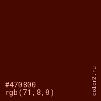 Цвет #470800 в цветовой модели RGB обозначается тремя октетами (71, 8, 0) в десятичном формате и #470800 в шестнадцатиричном (hex) формате, которые являются интенсивностью красного 71 (hex 47), интенсивность зелёного 8 (hex 08) и интенсивность синего 0 (hex 00).