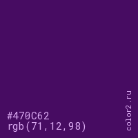 Цвет #470C62 в цветовой модели RGB обозначается тремя октетами (71, 12, 98) в десятичном формате и #470C62 в шестнадцатиричном (hex) формате, которые являются интенсивностью красного 71 (hex 47), интенсивность зелёного 12 (hex 0C) и интенсивность синего 98 (hex 62).