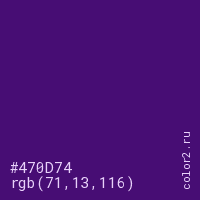 Цвет #470D74 в цветовой модели RGB обозначается тремя октетами (71, 13, 116) в десятичном формате и #470D74 в шестнадцатиричном (hex) формате, которые являются интенсивностью красного 71 (hex 47), интенсивность зелёного 13 (hex 0D) и интенсивность синего 116 (hex 74).