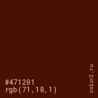 Цвет #471201 в цветовой модели RGB обозначается тремя октетами (71, 18, 1) в десятичном формате и #471201 в шестнадцатиричном (hex) формате, которые являются интенсивностью красного 71 (hex 47), интенсивность зелёного 18 (hex 12) и интенсивность синего 1 (hex 01).