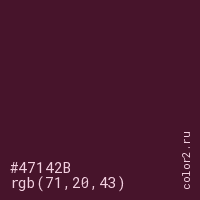 Цвет #47142B в цветовой модели RGB обозначается тремя октетами (71, 20, 43) в десятичном формате и #47142B в шестнадцатиричном (hex) формате, которые являются интенсивностью красного 71 (hex 47), интенсивность зелёного 20 (hex 14) и интенсивность синего 43 (hex 2B).