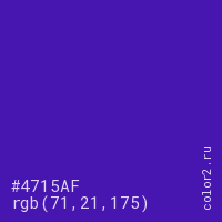 Цвет #4715AF в цветовой модели RGB обозначается тремя октетами (71, 21, 175) в десятичном формате и #4715AF в шестнадцатиричном (hex) формате, которые являются интенсивностью красного 71 (hex 47), интенсивность зелёного 21 (hex 15) и интенсивность синего 175 (hex AF).