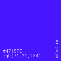 Цвет #4715FE в цветовой модели RGB обозначается тремя октетами (71, 21, 254) в десятичном формате и #4715FE в шестнадцатиричном (hex) формате, которые являются интенсивностью красного 71 (hex 47), интенсивность зелёного 21 (hex 15) и интенсивность синего 254 (hex FE).