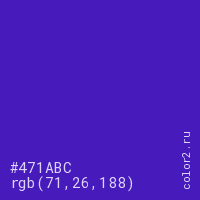 Цвет #471ABC в цветовой модели RGB обозначается тремя октетами (71, 26, 188) в десятичном формате и #471ABC в шестнадцатиричном (hex) формате, которые являются интенсивностью красного 71 (hex 47), интенсивность зелёного 26 (hex 1A) и интенсивность синего 188 (hex BC).