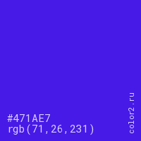 Цвет #471AE7 в цветовой модели RGB обозначается тремя октетами (71, 26, 231) в десятичном формате и #471AE7 в шестнадцатиричном (hex) формате, которые являются интенсивностью красного 71 (hex 47), интенсивность зелёного 26 (hex 1A) и интенсивность синего 231 (hex E7).