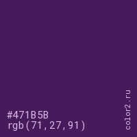 Цвет #471B5B в цветовой модели RGB обозначается тремя октетами (71, 27, 91) в десятичном формате и #471B5B в шестнадцатиричном (hex) формате, которые являются интенсивностью красного 71 (hex 47), интенсивность зелёного 27 (hex 1B) и интенсивность синего 91 (hex 5B).