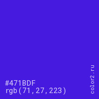 Цвет #471BDF в цветовой модели RGB обозначается тремя октетами (71, 27, 223) в десятичном формате и #471BDF в шестнадцатиричном (hex) формате, которые являются интенсивностью красного 71 (hex 47), интенсивность зелёного 27 (hex 1B) и интенсивность синего 223 (hex DF).