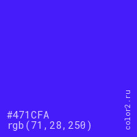 Цвет #471CFA в цветовой модели RGB обозначается тремя октетами (71, 28, 250) в десятичном формате и #471CFA в шестнадцатиричном (hex) формате, которые являются интенсивностью красного 71 (hex 47), интенсивность зелёного 28 (hex 1C) и интенсивность синего 250 (hex FA).