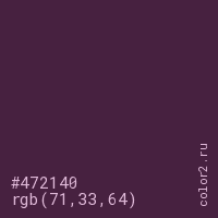 Цвет #472140 в цветовой модели RGB обозначается тремя октетами (71, 33, 64) в десятичном формате и #472140 в шестнадцатиричном (hex) формате, которые являются интенсивностью красного 71 (hex 47), интенсивность зелёного 33 (hex 21) и интенсивность синего 64 (hex 40).