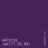 Цвет #472158 в цветовой модели RGB обозначается тремя октетами (71, 33, 88) в десятичном формате и #472158 в шестнадцатиричном (hex) формате, которые являются интенсивностью красного 71 (hex 47), интенсивность зелёного 33 (hex 21) и интенсивность синего 88 (hex 58).