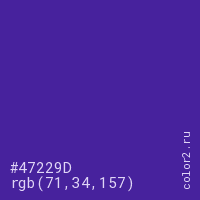 Цвет #47229D в цветовой модели RGB обозначается тремя октетами (71, 34, 157) в десятичном формате и #47229D в шестнадцатиричном (hex) формате, которые являются интенсивностью красного 71 (hex 47), интенсивность зелёного 34 (hex 22) и интенсивность синего 157 (hex 9D).