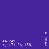 Цвет #47249E в цветовой модели RGB обозначается тремя октетами (71, 36, 158) в десятичном формате и #47249E в шестнадцатиричном (hex) формате, которые являются интенсивностью красного 71 (hex 47), интенсивность зелёного 36 (hex 24) и интенсивность синего 158 (hex 9E).