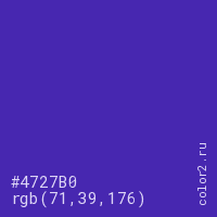 Цвет #4727B0 в цветовой модели RGB обозначается тремя октетами (71, 39, 176) в десятичном формате и #4727B0 в шестнадцатиричном (hex) формате, которые являются интенсивностью красного 71 (hex 47), интенсивность зелёного 39 (hex 27) и интенсивность синего 176 (hex B0).