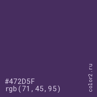 Цвет #472D5F в цветовой модели RGB обозначается тремя октетами (71, 45, 95) в десятичном формате и #472D5F в шестнадцатиричном (hex) формате, которые являются интенсивностью красного 71 (hex 47), интенсивность зелёного 45 (hex 2D) и интенсивность синего 95 (hex 5F).