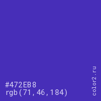 Цвет #472EB8 в цветовой модели RGB обозначается тремя октетами (71, 46, 184) в десятичном формате и #472EB8 в шестнадцатиричном (hex) формате, которые являются интенсивностью красного 71 (hex 47), интенсивность зелёного 46 (hex 2E) и интенсивность синего 184 (hex B8).