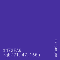 Цвет #472FA0 в цветовой модели RGB обозначается тремя октетами (71, 47, 160) в десятичном формате и #472FA0 в шестнадцатиричном (hex) формате, которые являются интенсивностью красного 71 (hex 47), интенсивность зелёного 47 (hex 2F) и интенсивность синего 160 (hex A0).