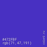 Цвет #472FBF в цветовой модели RGB обозначается тремя октетами (71, 47, 191) в десятичном формате и #472FBF в шестнадцатиричном (hex) формате, которые являются интенсивностью красного 71 (hex 47), интенсивность зелёного 47 (hex 2F) и интенсивность синего 191 (hex BF).