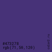 Цвет #473278 в цветовой модели RGB обозначается тремя октетами (71, 50, 120) в десятичном формате и #473278 в шестнадцатиричном (hex) формате, которые являются интенсивностью красного 71 (hex 47), интенсивность зелёного 50 (hex 32) и интенсивность синего 120 (hex 78).