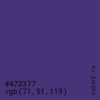 Цвет #473377 в цветовой модели RGB обозначается тремя октетами (71, 51, 119) в десятичном формате и #473377 в шестнадцатиричном (hex) формате, которые являются интенсивностью красного 71 (hex 47), интенсивность зелёного 51 (hex 33) и интенсивность синего 119 (hex 77).