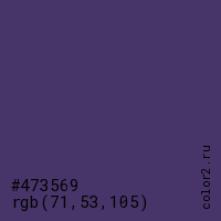 Цвет #473569 в цветовой модели RGB обозначается тремя октетами (71, 53, 105) в десятичном формате и #473569 в шестнадцатиричном (hex) формате, которые являются интенсивностью красного 71 (hex 47), интенсивность зелёного 53 (hex 35) и интенсивность синего 105 (hex 69).