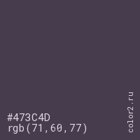 Цвет #473C4D в цветовой модели RGB обозначается тремя октетами (71, 60, 77) в десятичном формате и #473C4D в шестнадцатиричном (hex) формате, которые являются интенсивностью красного 71 (hex 47), интенсивность зелёного 60 (hex 3C) и интенсивность синего 77 (hex 4D).